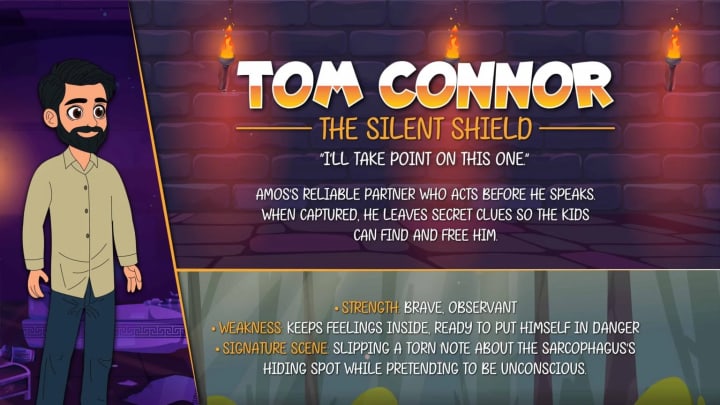 Amos’s reliable partner who acts before he speaks. When captured, he leaves secret clues so the kids can find and free him.
