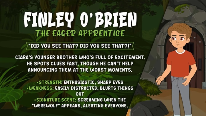 Ciara’s younger brother who’s full of excitement. He spots clues fast, though he can’t help announcing them at the worst moments.