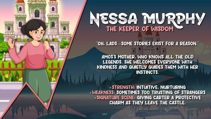 Amos’s mother, who knows all the old legends. She welcomes everyone with kindness and quietly guides them with her instincts.