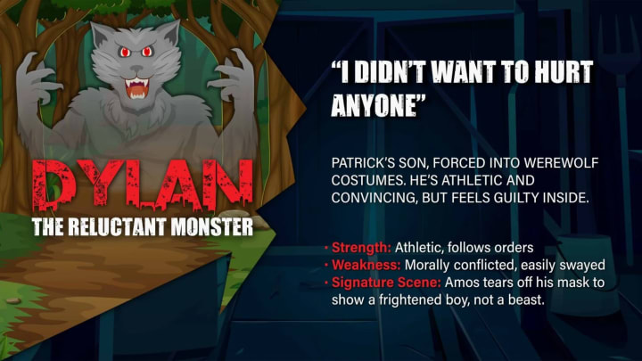 Patrick’s son, forced into werewolf costumes. He’s athletic and convincing, but feels guilty inside.