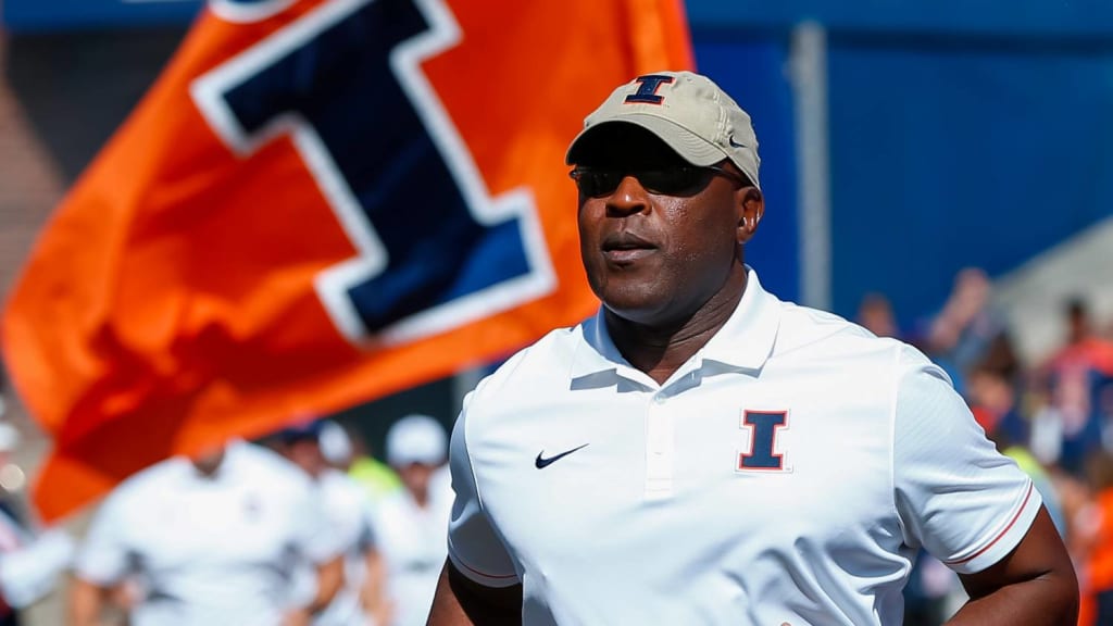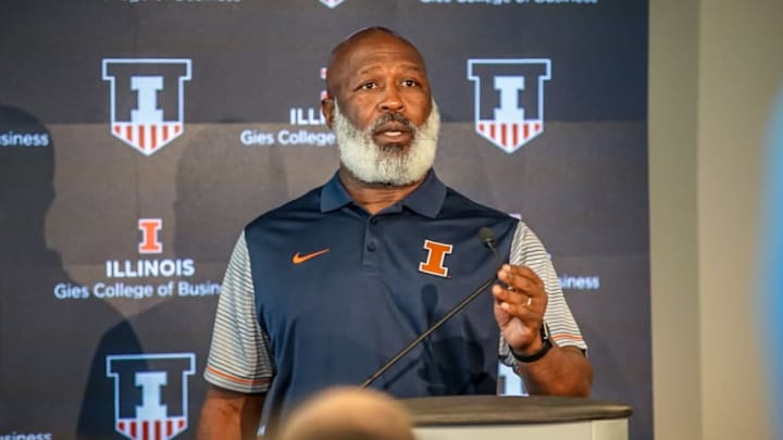 University of Illinois Head Football Coach Lovie Smith Fielding Questions at a Press Conference. Note the name and logo of the Gies College of Business behind him.
