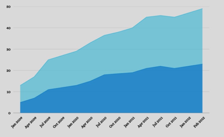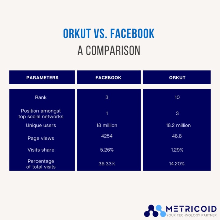 The above visual illustration demonstrates the amount of daily unique visitors until a course of time, precisely, 2011. Notice the gradual decline of Google’s Orkut usage (indicated in deep blue) around the mid of 2010?