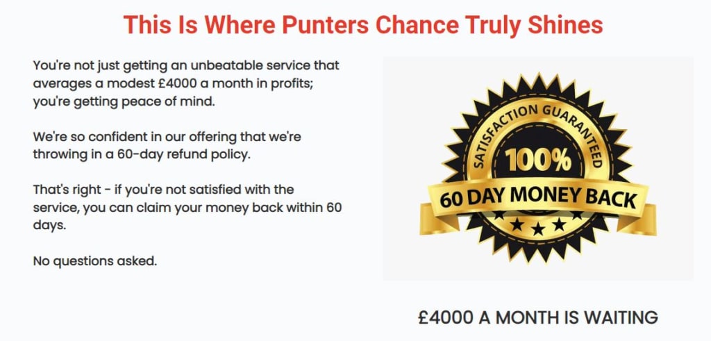 We understand that you may have doubts. That's why Punters Chance offers a remarkable 60-day money-back guarantee.