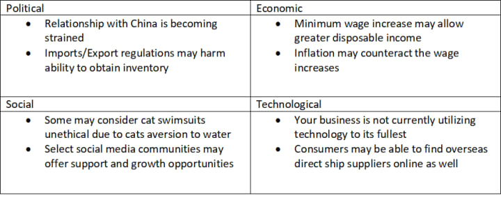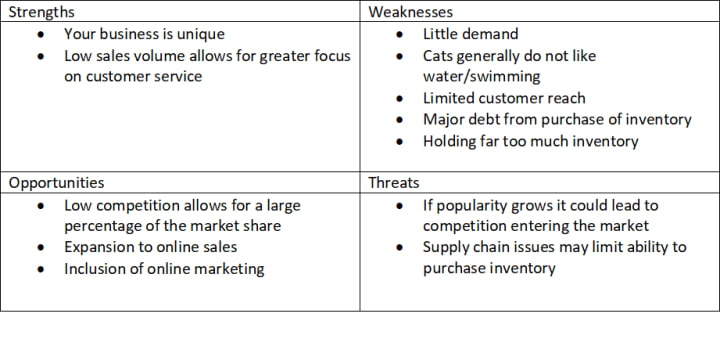 Scenario: We’ll say you exclusively sell swim wear for house cats. Your supplies come from China and you primarily advertise via flyers, word of mouth, and local newspapers.