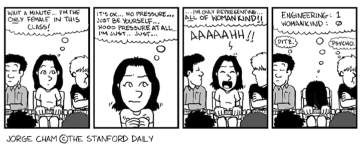 In one of the classes I took as a sophomore, I was the only girl. Although I pretty much knew everyone in my class, it was hard for me to feel comfortable saying things in class at first. The professor would ask questions that I knew the answer to and no one would answer. I wanted to answer so bad but I was afraid I could be wrong and if I was I would look like the dumb girl in the class; if I was right, would I look like a know-it-all? Most of the time I didn't answer it was because I didn't feel like being challenged as it begins to be exhausting. It took a while for me to be confident enough to answer questions and make comments during class, despite sometimes being shot down.