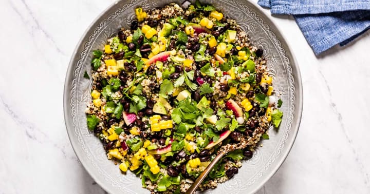 Combine cooked quinoa, black beans, diced bell peppers, diced red onion, and chopped cilantro in a large bowl. For the dressing, mix together olive oil, lime juice, cumin, and garlic powder. Toss the dressing with the quinoa mixture and serve.