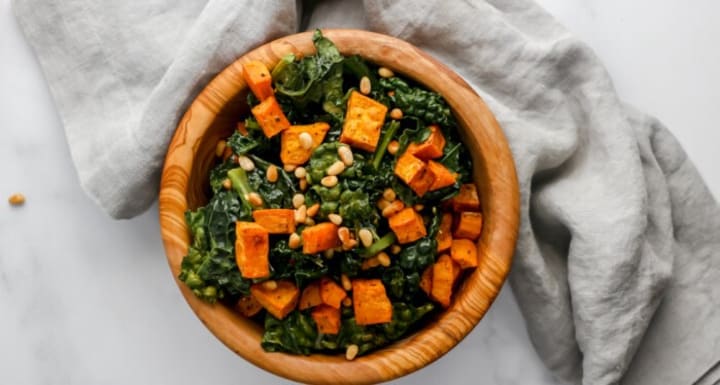 Roast diced sweet potato in the oven with a drizzle of olive oil, salt, and pepper until tender. Sauté kale with garlic and onion in a separate pan. Serve the roasted sweet potato and sautéed kale over a bed of cooked quinoa or brown rice. Top with sliced avocado and a squeeze of fresh lime juice.