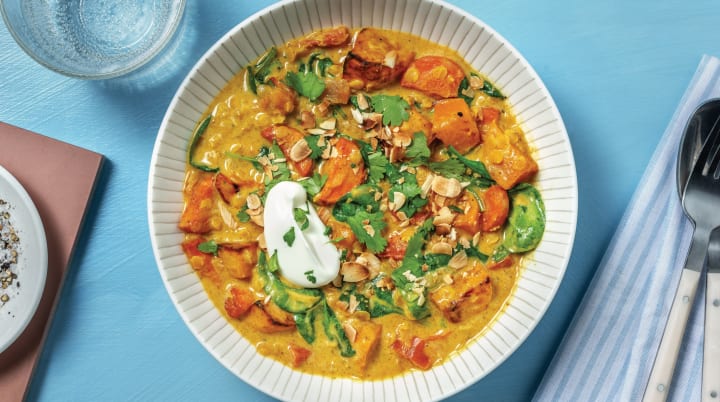 Sauté diced onion, garlic, and ginger in a large pot until fragrant. Add diced carrots, bell peppers, and cauliflower, and cook until the vegetables are tender. Add cooked lentils, coconut milk, curry powder, and turmeric to the pot, and let simmer until the flavors are blended together.