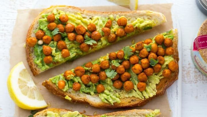 Mash cooked chickpeas with avocado, lemon juice, salt, and pepper for a delicious and healthy toast topping. Spread the chickpea and avocado mixture on a slice of toasted whole grain bread, and top with sliced tomatoes and a sprinkle of nutritional yeast.