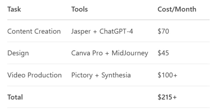 - ChatGPT-4 for strategy → MidJourney for graphics → Synthesia for video → Copy.ai for ad copy.