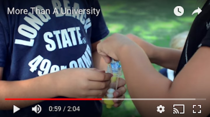 * Watch the very well made, well produced marketing video made by the university entitled "More Than A University." And there—halfway through the video—the only person pictured in a piece of university apparel is a young boy wearing a t-shirt identifying him as a camper....at Long Beach State!
