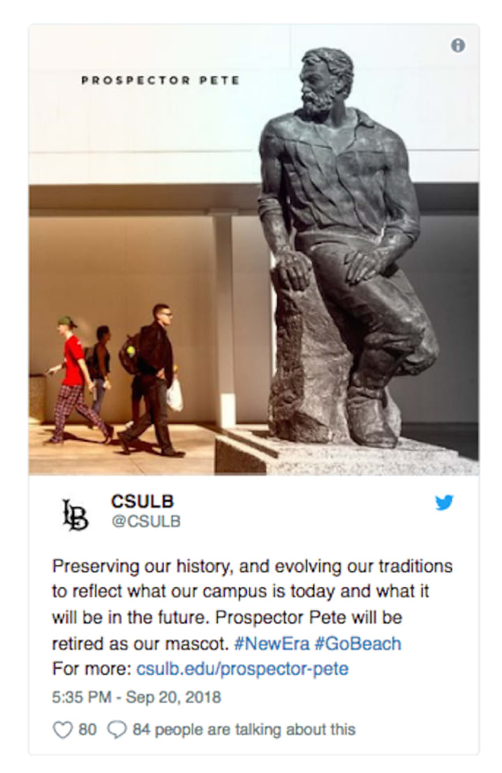 Likewise, Prospector Pete—the longtime mascot of Long Beach State (or California State University, Long Beach, or CSULB—you know the drill) is not just being retired, but erased from the campus. The Cal State System had issued guidance that "human mascots" should no longer be associated with their campuses. And so, Prospector Pete—representing the miners of the era of California's Gold Rush—and the sometimes not so kind things they did to Native Americans and women in the region—has come under fire, prompting the administration to take action. And so, not only will the cartoonish mascot version of Prospector Pete no loner be used by the university in any official manner, but the large bronze statue of him in the central part of campus will soon be removed and relegated to a yet to be built alumni building on campus (meaning that it is headed for the proverbial "warehouse of history" for some time). For a very good overview of this controversy, see the recent New York Times piece on the saga of Prospector Pete.