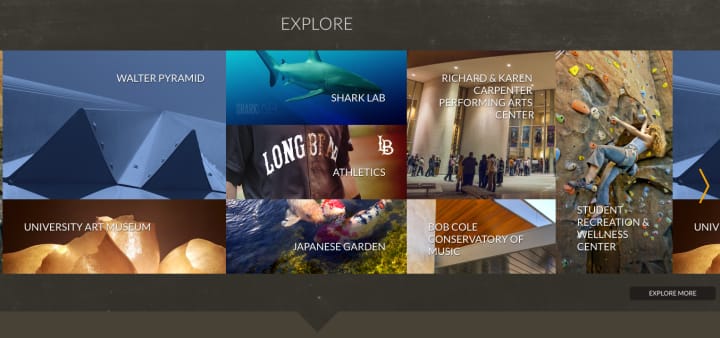 * Also on the welcome page of the university's website, visitors are encouraged to "Explore"—but there again one sees "Long Beach," rather than any reference to either California State University, Long Beach, or CSULB.