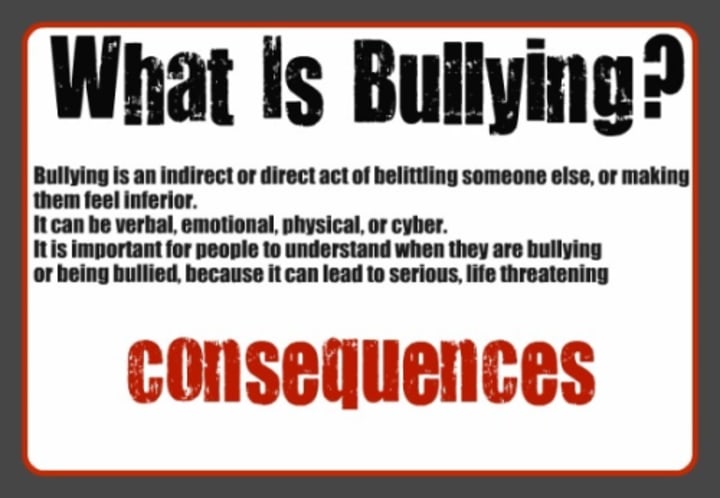 Bullying has been around as long as the human race has existed, and it does not stop after childhood or even young adulthood. Wherever there is a perception of power versus powerlessness, status quo versus different, or victimizer versus victim, someone will be the target of a bully. “Bullying includes behaviors that focus on making someone else feel inadequate, or focus on belittling someone else. Bullying includes harassment, physical harm, repeatedly demeaning speech and efforts to ostracize another person. Bullying is active, and is done with the intention of bringing another person down” (Teenage Bullying: http://www.bullyingstatistics.org/content/teenage-bullying.html.) Bullying is classified in two major categories. Indirect bullying, which uses verbalized and written communications to humiliate and intimidate, and direct bullying, which uses vocalized threat, physical force, and bodily harm to degrade, control, and terrorize. Bullying can occur anywhere but it is especially problematic in elementary school, middle school, and high schools or at the workplace. A bullying survey in 2011, at Klamath Community College in Klamath Falls, Oregon showed that bullying affects children, teenagers, and adults, male or female, gay or straight equally. It does not matter your societal status, religious affiliation or your ethnic or racial background. Anybody can be a victim and anyone can be the victimizer. Bullying is a form of violence that is an aggressive behavior involving the imbalance of power between the one being bullied (the victim) and the bully (the perpetrator). Bullying should never be ignored or condoned; it is not a natural way of interrelating with others. “It can define a person as an adult. It can cause people to kill themselves over it or kill others” (anonymous person Klamath Community College (KCC) Bullying Survey (2011).