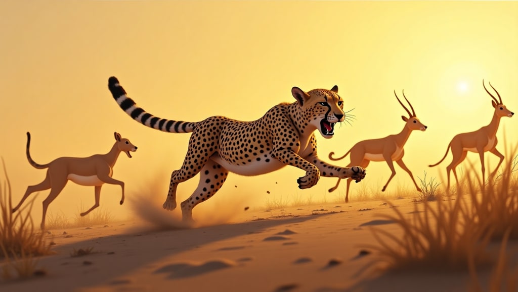 In the vast grasslands of the African savanna, there lived a young cheetah named Kito. Kito was the fastest of his siblings, with sleek golden fur covered in black spots and legs that could carry him like the wind. But despite his incredible speed, Kito had one great flaw—he was impatient.