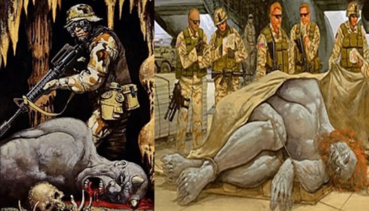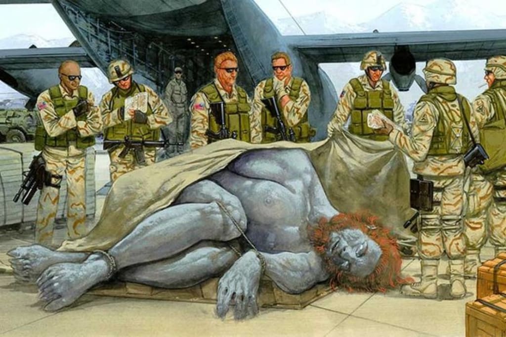 A 13-foot-tall beast with flaming red hair, six fingers on each hand, and two sets of teeth was alleged to have been killed by an elite tactical unit in 2002.