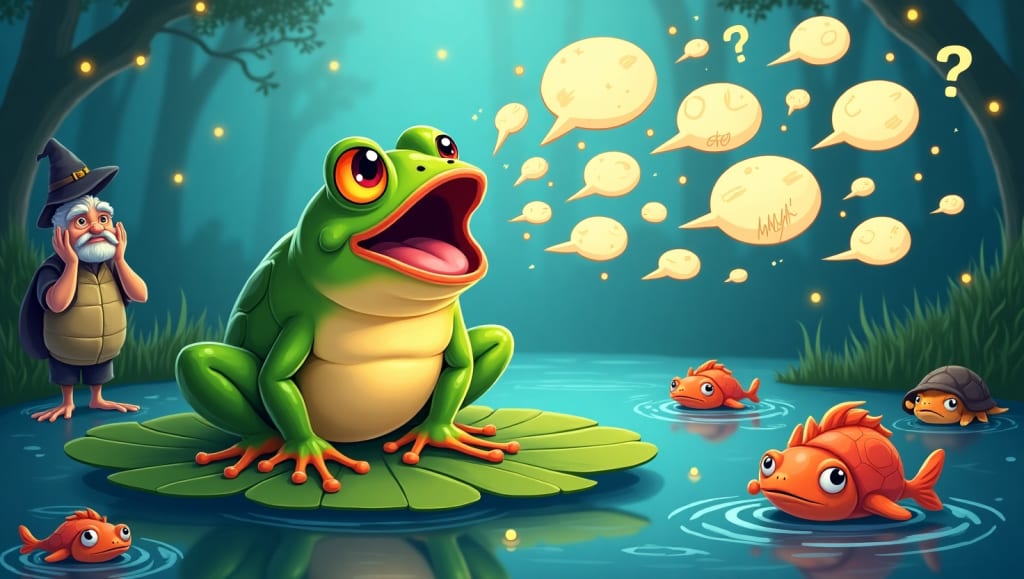 Felix loved to talk. He croaked from sunrise to sunset, boasting about his strength, his speed, and his wisdom. He would puff up his chest and declare, "I am the fastest swimmer in the pond! No one can jump as high as I can! My voice is the most beautiful sound in the world!"