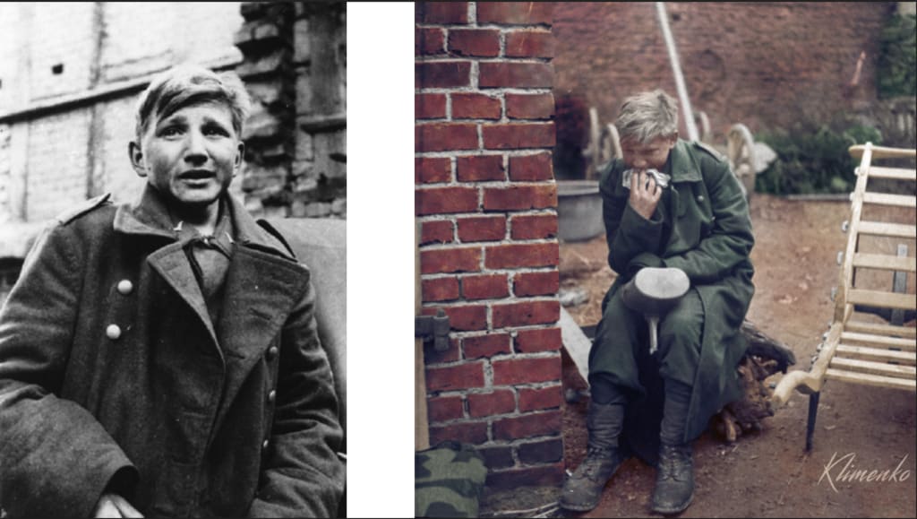 The popular picture of a crying child soldier was taken in 1945. It shows Hans-Georg Henke, a young German. The picture has been used to show how the people of Germany felt in the last days of the Second World War.