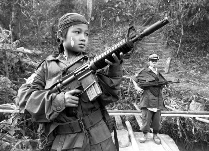 The Karen, a group of people who speak a different language, have been fighting against the Myanmar (formerly Burma) government for a long time. A UN report says that in 2001, about 50,000 children in Myanmar were in the armed forces of the government or the opposition.