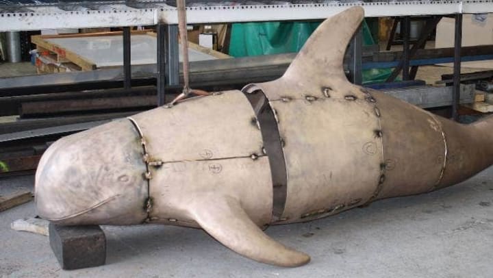 According to the artist, creating the sculpture was a time-consuming process. Initially, a 3.5-meter-long life-size model of the dolphin was carved out of polyurethane foam as the first step in the process.