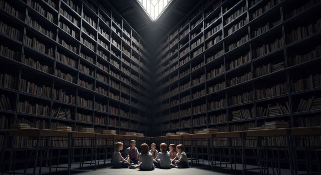 The small group of children sitting on the floor, their backs against the shelves, trying to have a conversation—they are the hope. They are still connected to their own humanity, still reaching for each other, still learning in the only way that really matters: together, curiously, alive. The warehouse surrounds them, but it has not yet consumed them. There is still time to build something different, something worthy of their potential, something that will grow them rather than store them.