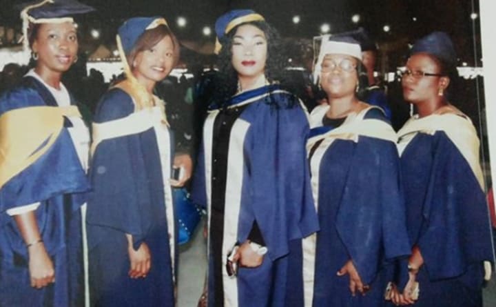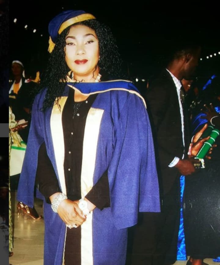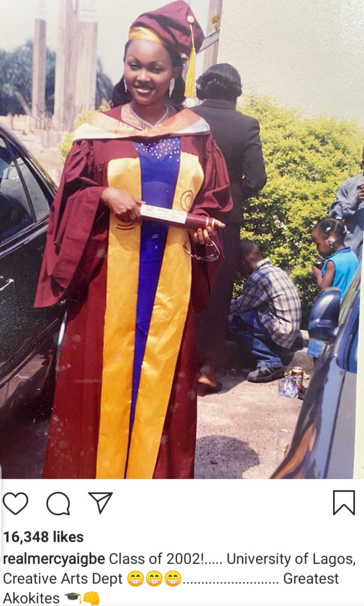 The next person on our list is also an actress who attended the University of Lagos, the beautiful Mercy Aigbe. Mercy posted a picture from her 2002 graduation from the University of Lagos where she studied in the Creative Arts department. The picture is such an early 2000s picture isn't it?