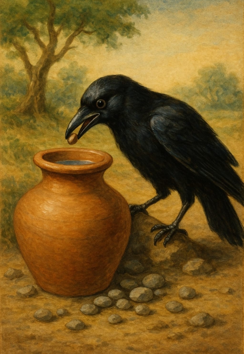 Before flying away, the crow looked back at the pot and the pile of stones beside it. “It is not always strength that wins,” he thought. “Sometimes, cleverness and perseverance matter even more.”
