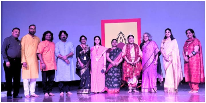 A lamp-lighting ceremony followed, accompanied by the soft melodies of the school choir. The stage was tastefully decorated with long posters depicting dance silhouettes and Odissi motifs, transforming the space into a sanctum of tradition and grace.