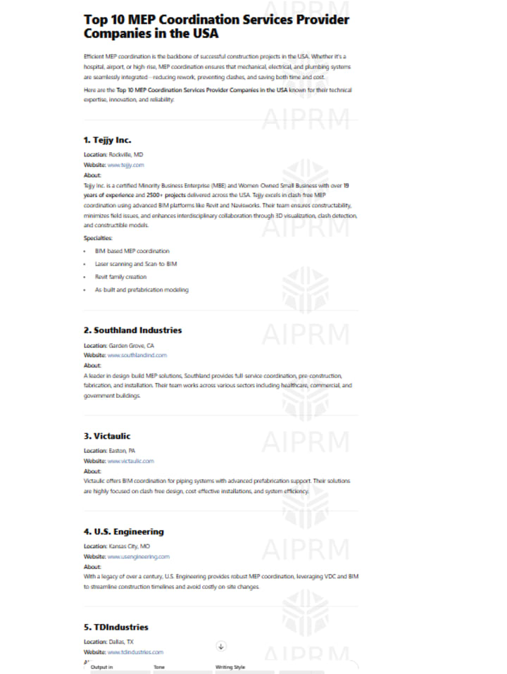 Choosing the right MEP coordination service provider can make or break the success of your project. Whether you need high-end BIM modeling, clash detection, or prefabrication support, these top 10 companies are known for delivering precision, efficiency, and innovation. Companies like Tejjy Inc. stand out for combining deep BIM expertise with years of proven success across all 50 states.