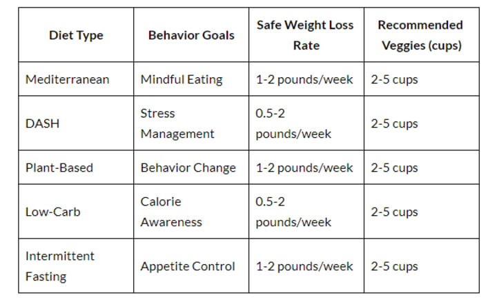 The Dietary Guidelines for Americans 2020–2025 encourage protein and vegetable consumption. Adding 2–5 cups of vegetables and adequate fiber will dramatically enhance health results from weight reduction regimens.