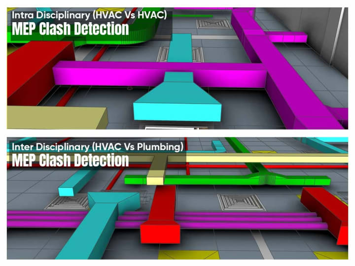 Clash detection serves as the construction industry's crystal ball, identifying conflicts before they become expensive jobsite problems. The software analyzes 3D models from different disciplines,, architectural, structural, mechanical, electrical, and plumbing, to spot where elements occupy the same space. Picture a structural beam running directly through a large HVAC duct, or electrical conduits conflicting with plumbing pipes. These clashes, which might go unnoticed in traditional 2D drawings until construction begins, get flagged early in the design phase. Teams can then redesign, relocate, or resize conflicting elements while changes remain inexpensive and easy to implement.