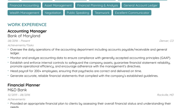 Includes Skills, work history, education, accomplishments