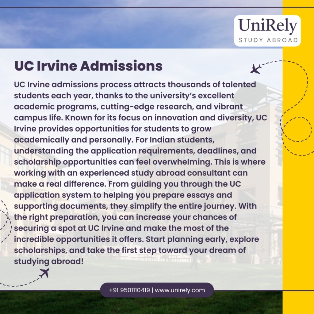 UC Irvine admissions process attracts thousands of talented students each year, thanks to the university’s excellent academic programs, cutting-edge research, and vibrant campus life. Known for its focus on innovation and diversity, UC Irvine provides opportunities for students to grow academically and personally. For Indian students, understanding the application requirements, deadlines, and scholarship opportunities can feel overwhelming. This is where working with an experienced study abroad consultant can make a real difference. From guiding you through the UC application system to helping you prepare essays and supporting documents, they simplify the entire journey. With the right preparation, you can increase your chances of securing a spot at UC Irvine and make the most of the incredible opportunities it offers. Start planning early, explore scholarships, and take the first step toward your dream of studying abroad!