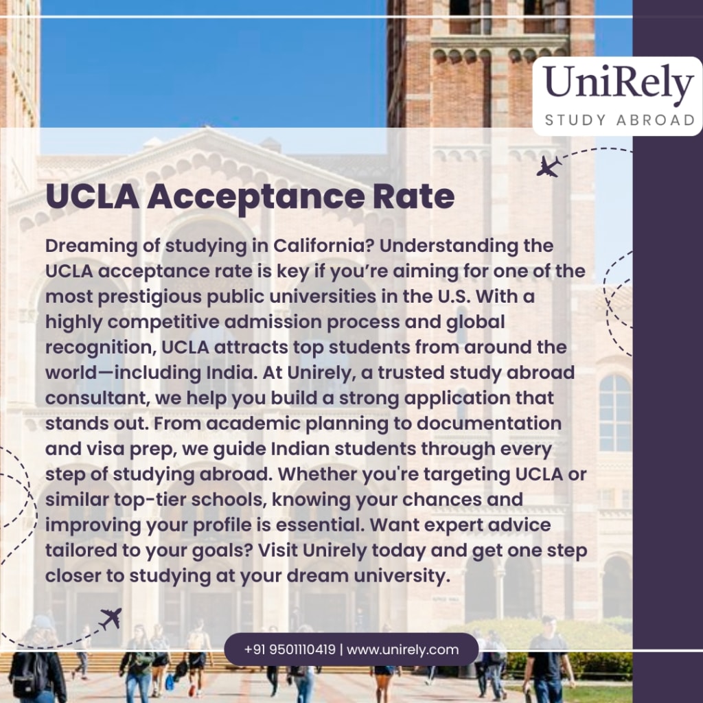 Dreaming of studying in California? Understanding the UCLA acceptance rate is key if you’re aiming for one of the most prestigious public universities in the U.S. With a highly competitive admission process and global recognition, UCLA attracts top students from around the world—including India. At Unirely, a trusted study abroad consultant, we help you build a strong application that stands out. From academic planning to documentation and visa prep, we guide Indian students through every step of studying abroad. Whether you're targeting UCLA or similar top-tier schools, knowing your chances and improving your profile is essential. Want expert advice tailored to your goals? Visit Unirely today and get one step closer to studying at your dream university.