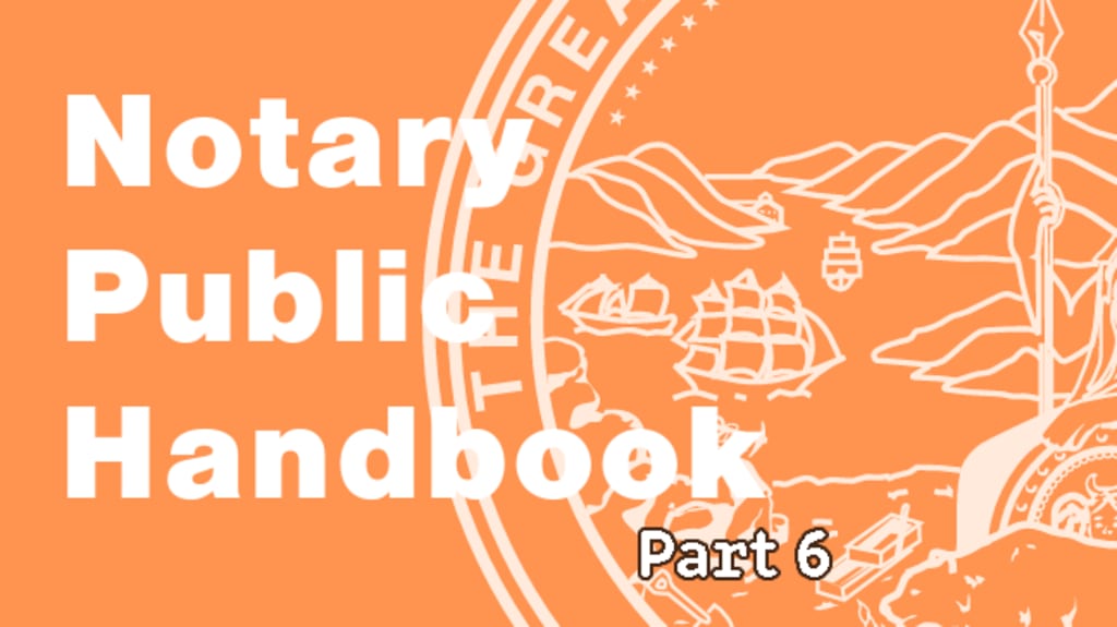 This is Part 6 of a series where I am sharing my experience and notes from reading the the evaluation of the California Notary Public Handbook, a tool written to assist in the interpretation of the various Codes that impact the work of a notary public in California.