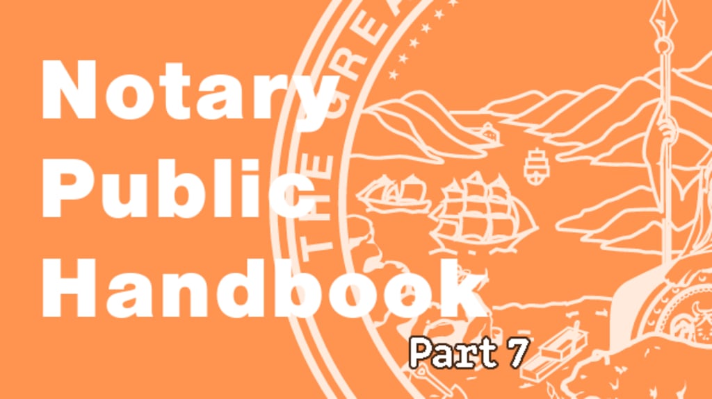 This is Part 7 of a series where I am sharing my experience and notes from reading the the evaluation of the California Notary Public Handbook, a tool written to assist in the interpretation of the various Codes that impact the work of a notary public in California.