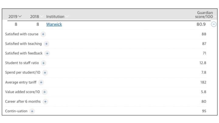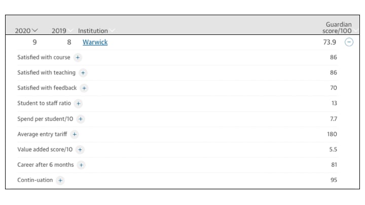 In 2019, the Guardian ranked Warwick University at 8th. Now, in 2020, Warwick has fallen to 9th place.