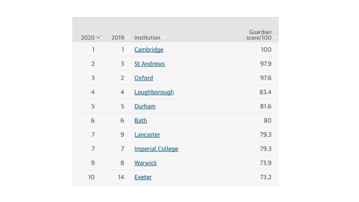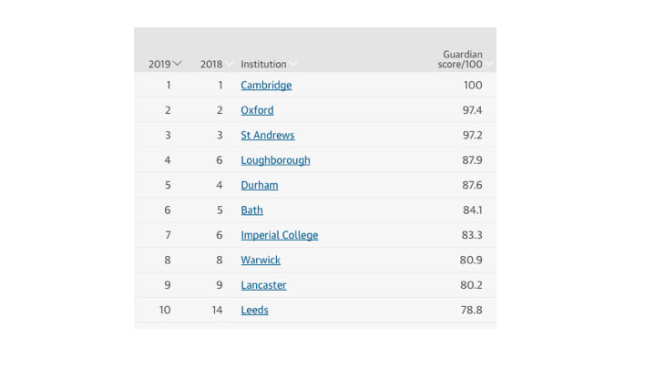 Initially, this minute variation in score from 2019 to 2020 may seem of little significance. In 2019, several top universities, including Durham, Bath, and Imperial College, received a reduced rating from the previous year (2018). This trend has continued within the Guardian's 2020 table, in which both Oxford and Warwick have been lowered by one place.