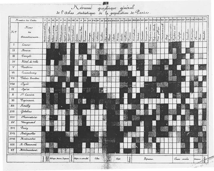 Heatmaps are assumed to have originated in the 19th century in the Paris districts. At that time manual gray-shading scale was used to present data patterns in tables and matrices.