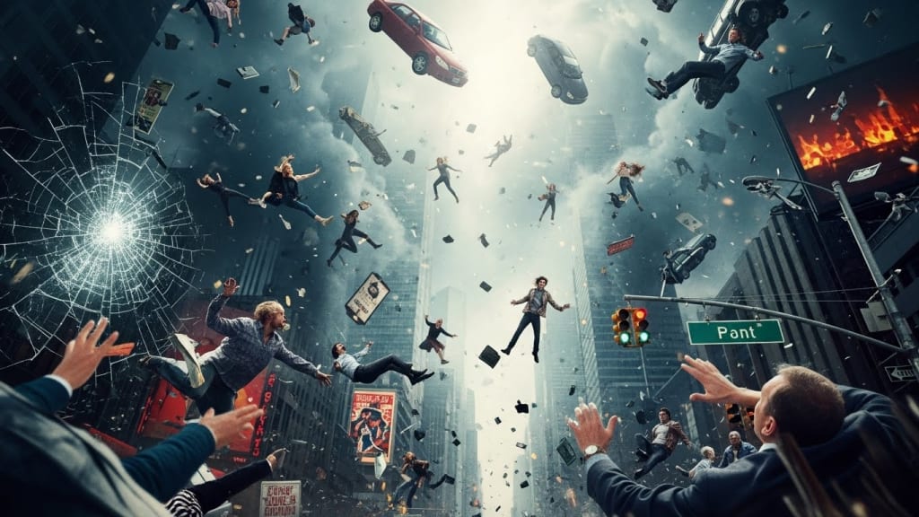 Shoes scraped upward against nothing. Briefcases tumbled skyward like startled birds. Screams erupted—raw, throat-scraping—as bodies rose in slow, inexorable ascent. Coffee splashed upward in dark arcs, droplets hanging like suspended jewels before drifting higher.