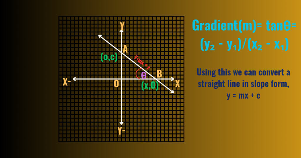 m = tanθ = (y₂ - y₁) / ( x₂- x₁),where θ = Inclination of the straight line,and(x₁,y₁), (x₂,y₂) are two points passes through the straight line.