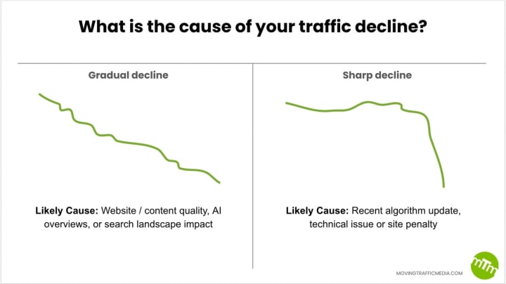 - Traffic collapse: With rankings gone, organic traffic evaporates