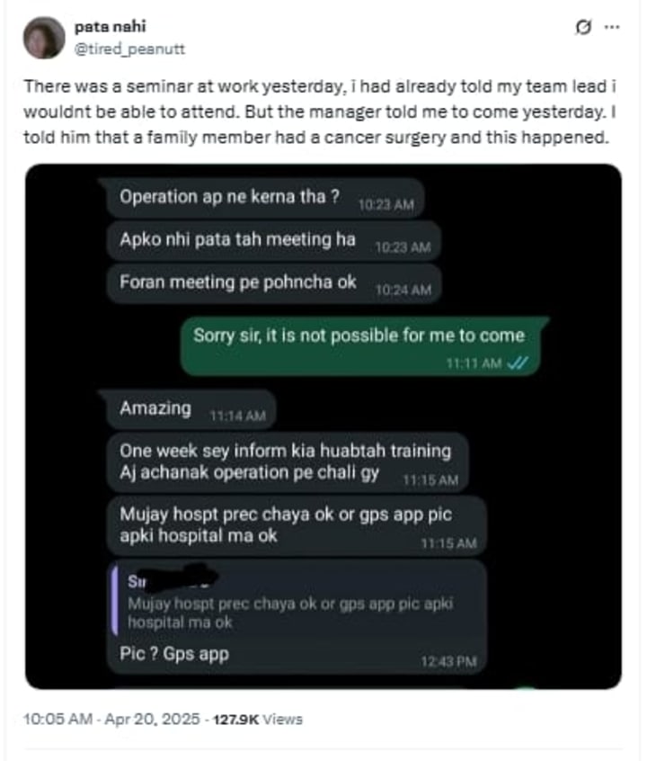 "There was a seminar at work yesterday. I had already told my team lead I wouldn't be able to attend. But the manager told me to come yesterday. I told him that a family member had cancer surgery, and this happened," she said as she shared the screenshot.