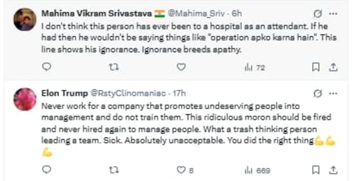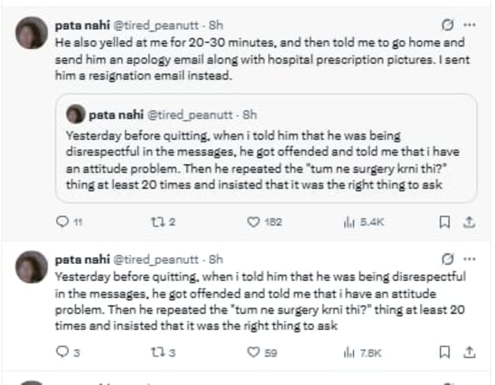 The situation escalated when the woman claimed her manager repeatedly questioned her and demanded verification of her absence. "When I told him he was being disrespectful, he got offended and said I am in no position to tell him how to do his job," she said in another post.