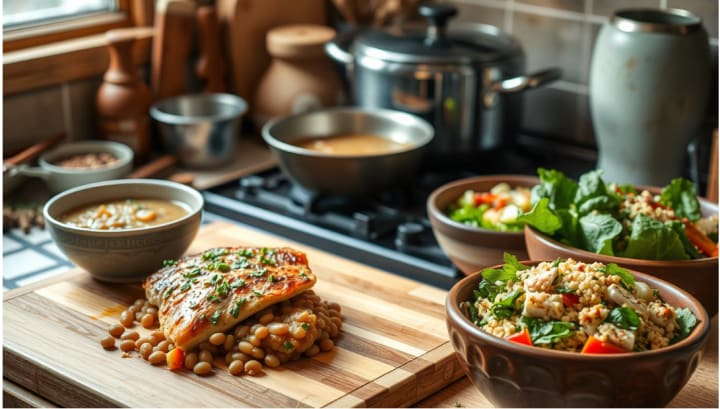 A cozy winter kitchen scene featuring a variety of colorful high-protein dishes, with steaming bowls of lentil soup, grilled chicken breast on a wooden cutting board, and vibrant quinoa salad with vegetables. Soft, warm lighting illuminates the space, highlighting fresh ingredients like beans, fish, and leafy greens in rustic bowls. The background includes a pot simmering on the stove, surrounded by spices and herbs, creating an inviting atmosphere for healthy cooking.