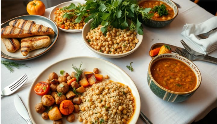 A cozy winter dinner table set with colorful plates of high-protein dishes, featuring grilled chicken, quinoa salad, roasted chickpeas, and a hearty lentil soup, surrounded by seasonal ingredients like winter vegetables and herbs, warm lighting creating a welcoming atmosphere.