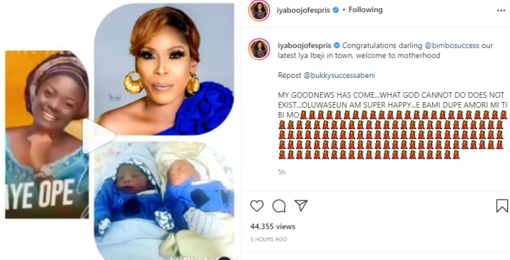 Colleagues of Bimbo such as Iyabo Ojo also took to Instagram to congratulate her. Iyabo wrote saying: "Congratulations darling @bimbosuccess our latest Iya Ibeji in town, welcome to motherhood."