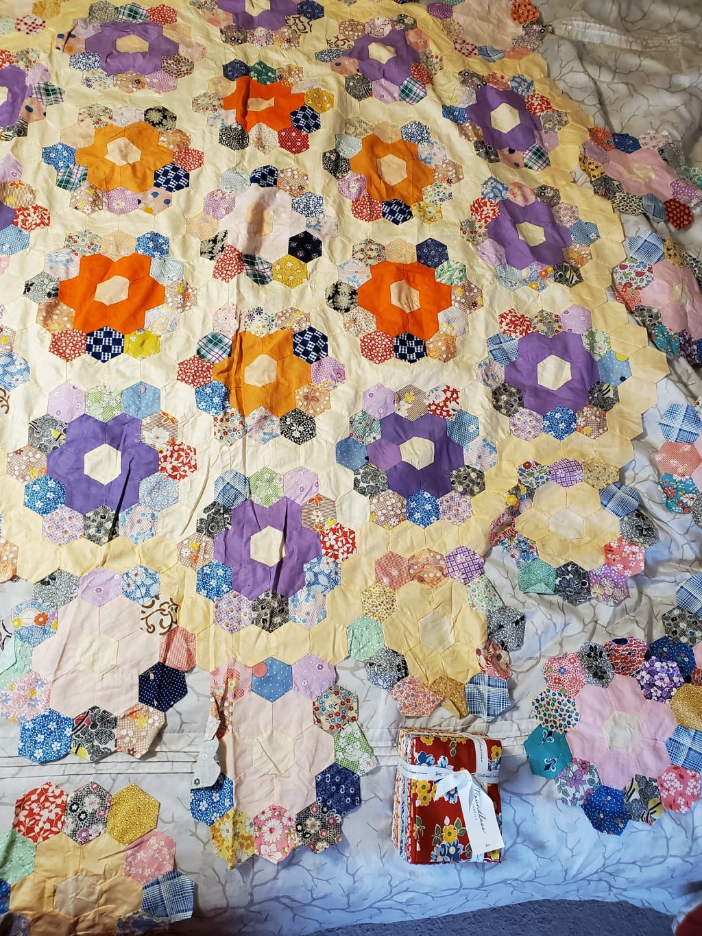 I found some vintage reproduction fabrics online, and have been using English paper piecing to stitch hexagons together to finish the quilt. It’s going to be obvious that three different women worked on it, but I don’t care. The quilt tells a story about women using their time and talents for others, and finding a way to create beautiful things from ordinary materials. It’s something I hope to pass on to my girls.