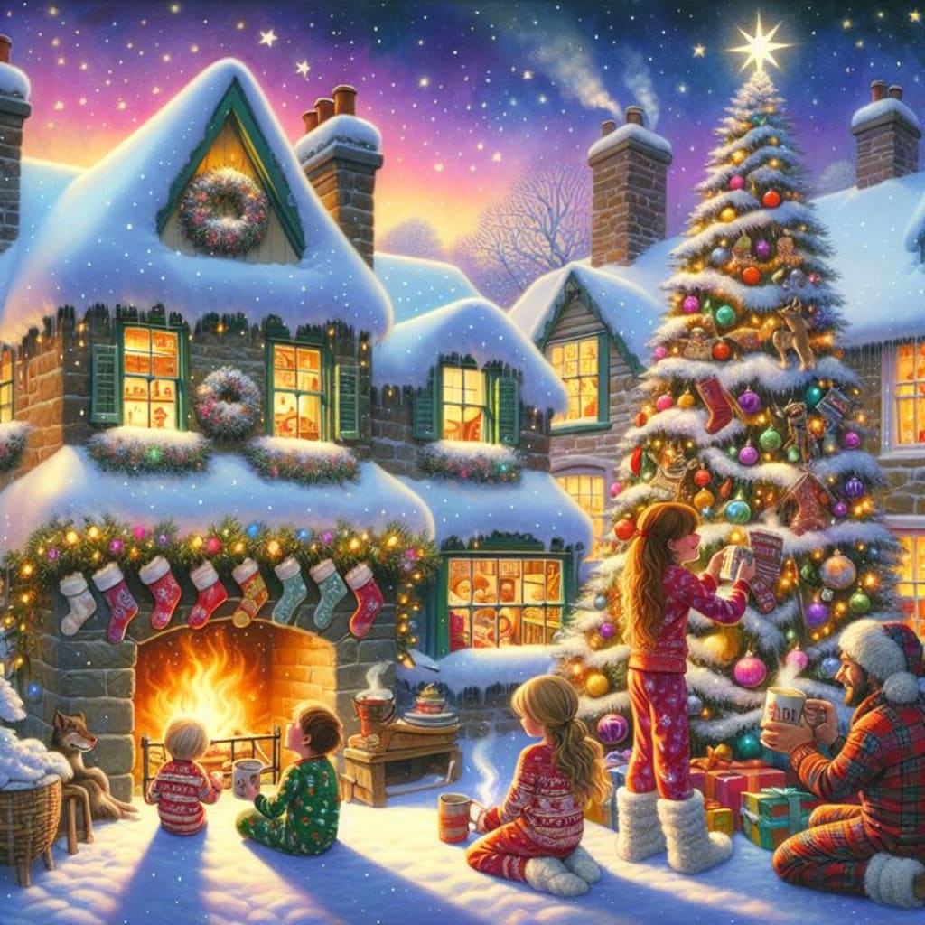 The snow fell gently on the little village of Everpine, blanketing the rooftops and cobbled streets in a sparkling coat of white. Strings of warm, golden lights hung from every lamppost, casting a soft glow over the bustling marketplace. It was Christmas Eve, and the air was alive with the hum of festive cheer.