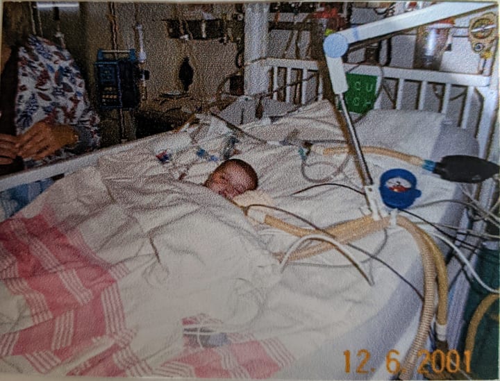 After a week in the ICU, you were taken off the ventilator and taken out of the coma. Unfortunately we had to deal with the withdrawal effects from morphine. That was hell on you and hell on me. You were on antibiotics, oxygen and a feeding tube that went up your little nose and into your tummy. You were being weaned off the morphine but it was still painful for you. You would scream and cry for hours and I would walk you up and down the room we were in. I couldn't take you out of that room because of your immune system.